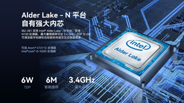 1、采用Intel® Alder Lake-N平台,搭载N100处理器,TDP仅6W,既能高效支持人脸识别系统的数据处理、信息存储与交互等核心任务,又因低功耗特性减少高温导致的死机风险,确保客流高峰时稳定运行。