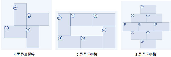 ● 支持多种拼接模式,显示形式简单自由拼接,可实现多种形状组合的多屏异形拼接,如下图: