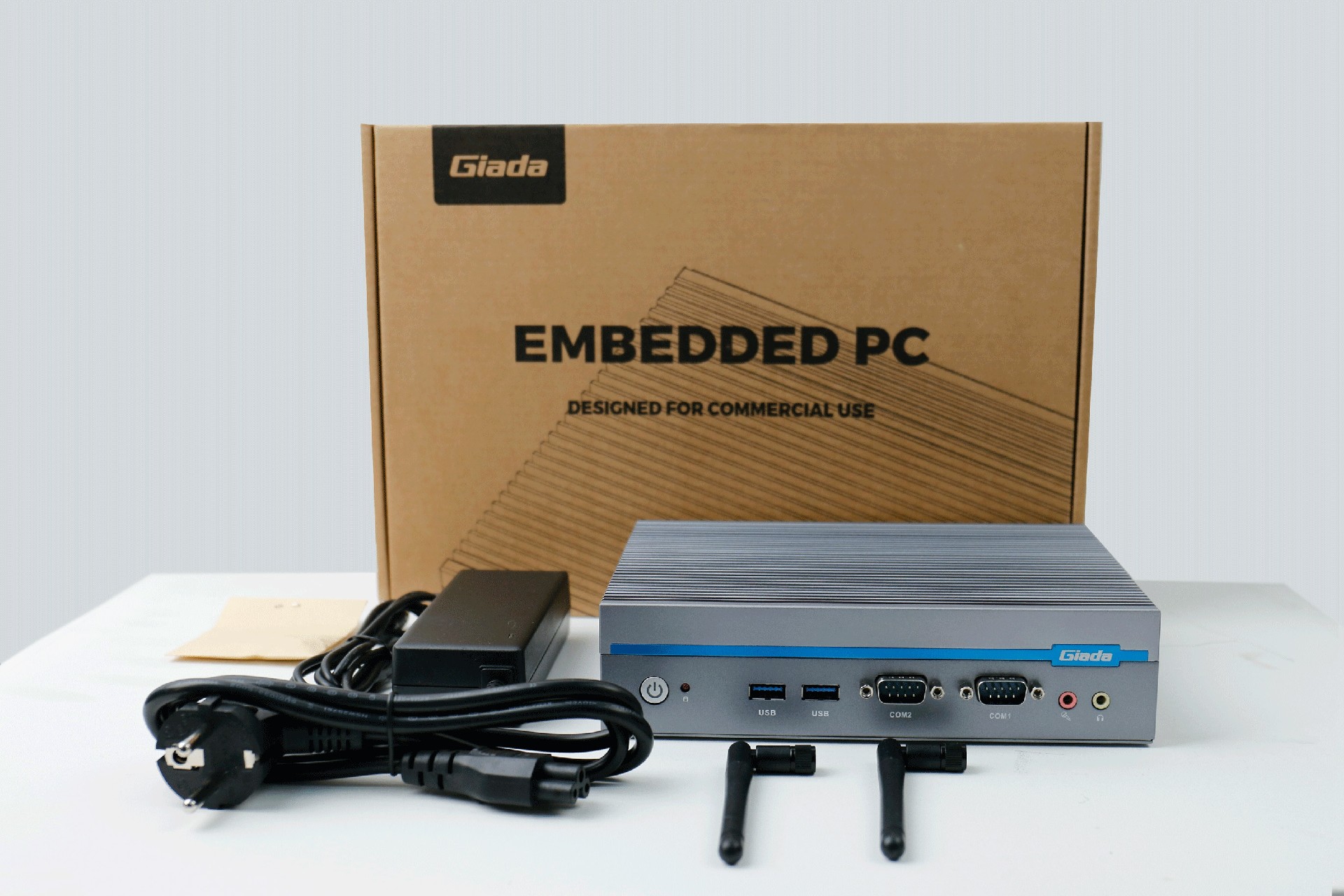 嵌入式整机AE613外包装采用环保材料设计,内部配备适配器、AC线、天线棒、螺丝包,满足通用需求,整机外观机壳顶面采用一体式铝板增高的鳍片散热设计,整机结构采用全铝设计保证散热与抗压性,通过米兰·(milantiyu)特有无风扇静音散热设计使整体散热效果非常优秀,同时营造出极致安静的工作和使用环境,无噪音,更防尘。