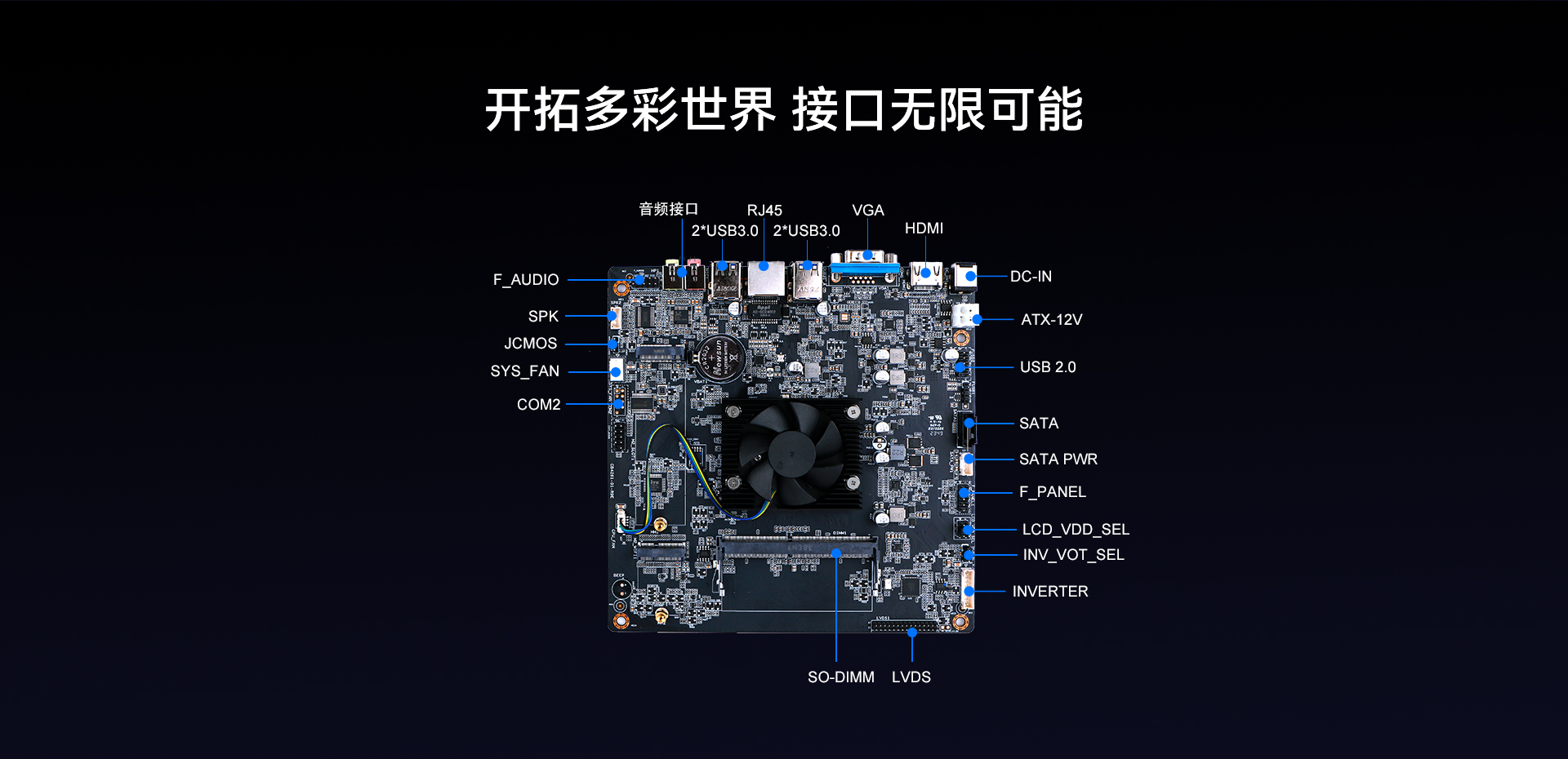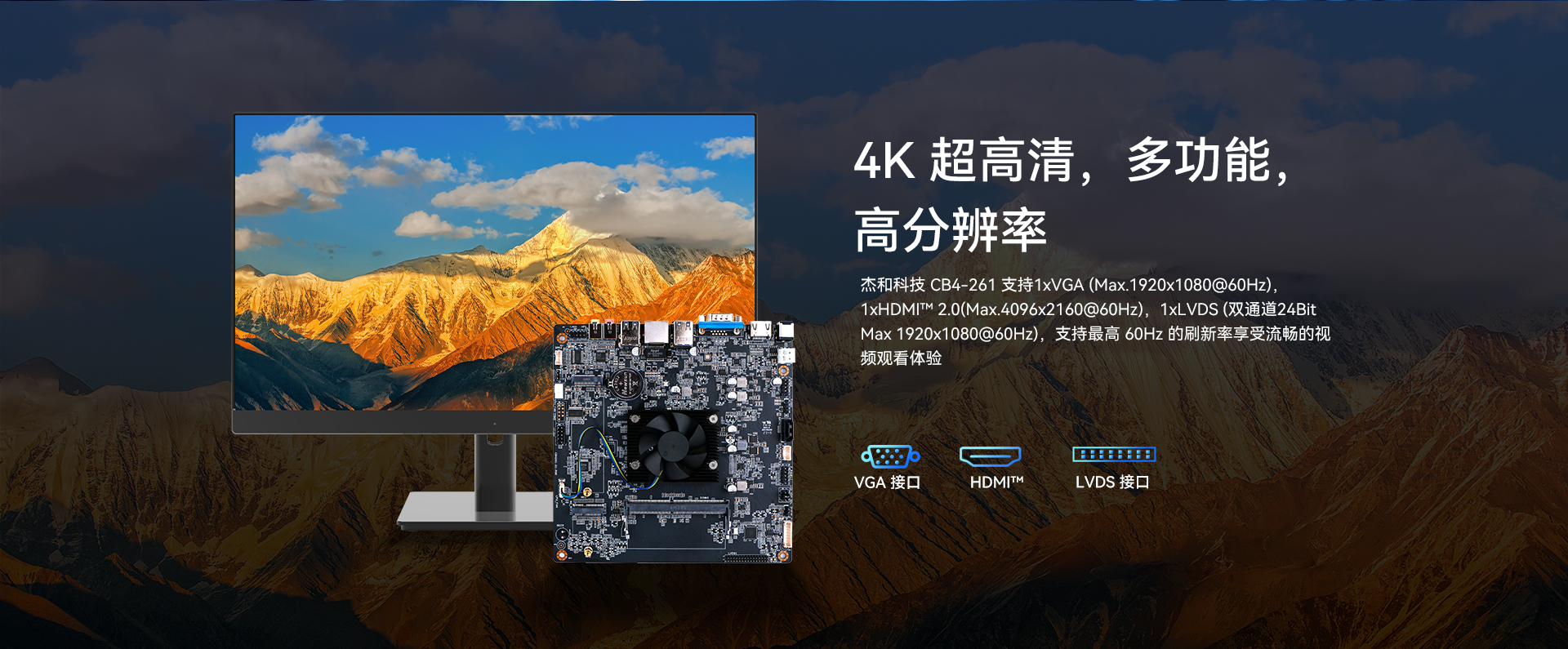 提供1x LVDS +1x HDMI™2.0+1x VGA 三视频接口输出