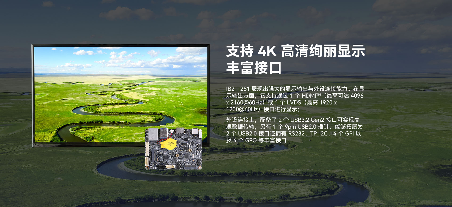 | 后I/O | 显示接口 | 1 x HDMI 2.0 (Max.4096x2160@60Hz) 1 x LVDS(Max.1920*1200@30Hz) |