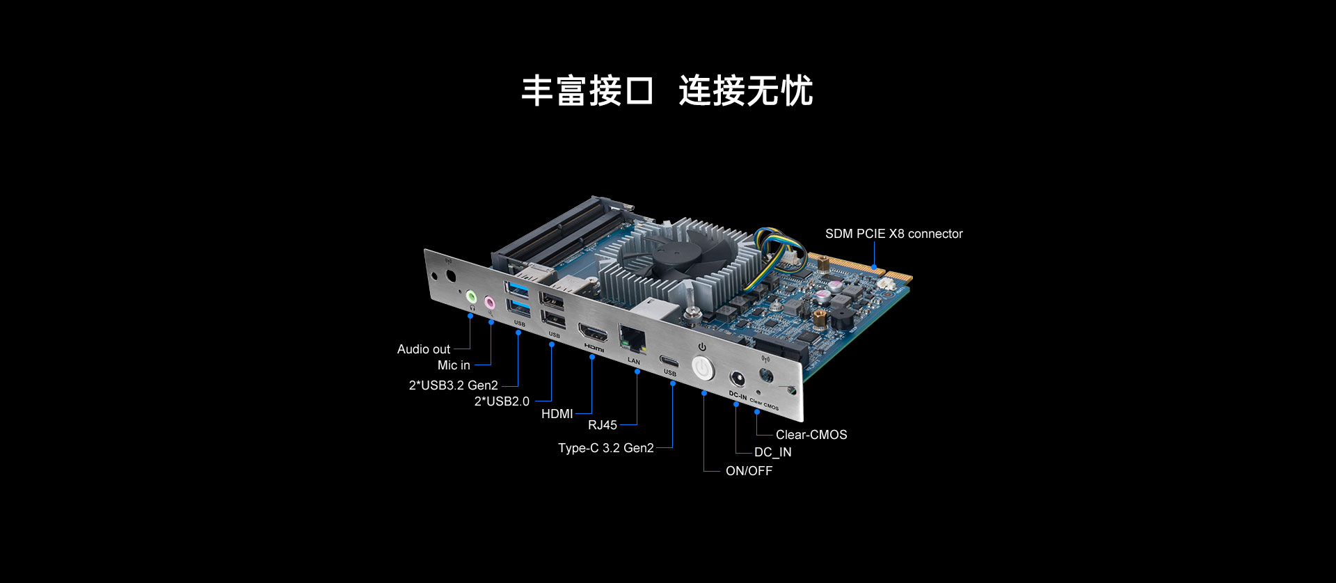 1 x  DP, 1 x HDMI显示,支持4K60Hz输出,PCIE x8 Edge Connector支持8K输出