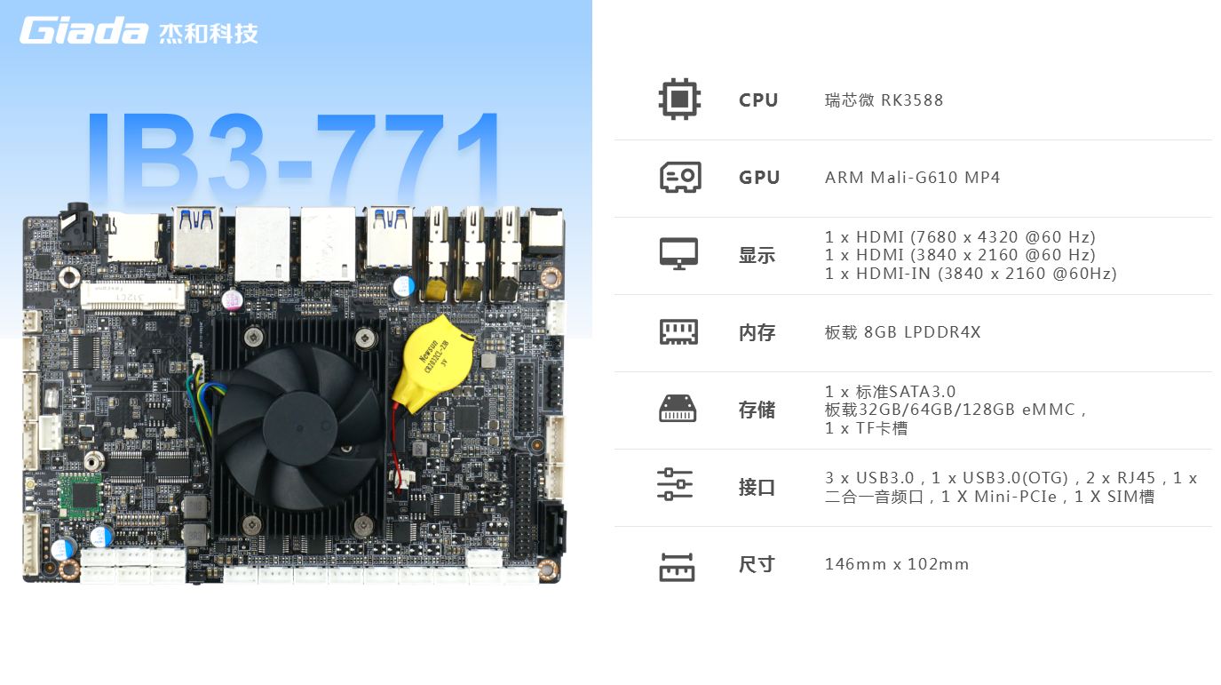 米兰·(milantiyu)主板IB3-771内置瑞芯微新一代旗舰级高端芯片RK3588,6TOPS算力的NPU,具有高算力、内存大、超强多媒体、多重扩展等技术优势。支持主流深度学习框架,能够为各类养老 AIOT 应用场景提供更优的性能表现。